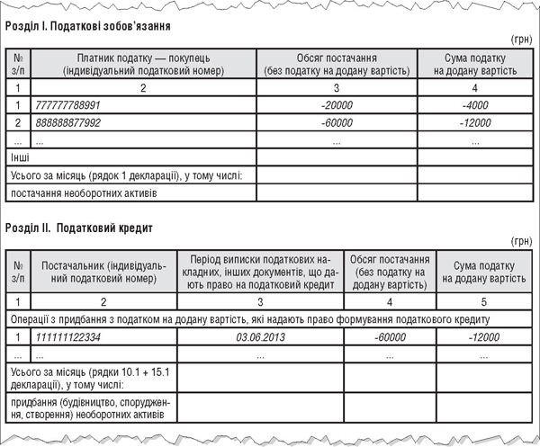 Зверніть увагу: додатки, що подаються у складі УР, містять лише вартісні показники, які відображаються на суму уточнення (збільшення або зменшення) зі знаком «+» або «-» та відповідають даним з графи 6 уточнюючого розрахунку. У разі якщо рядки графи 6 самого УР містять прочерки (при поданні декларації з ПДВ та УР на паперових носіях) чи не заповнені (при поданні декларації з ПДВ та УР в електронному вигляді), то додатки до таких рядків УР не подають (див. ЄБПЗ підкатегорії 101.23). Тобто фактично в «уточнюючому» додатку міститься тільки сума виправлення, і в жодному разі не заповнюється решта показників, які були у звичайному «звітному» додатку, що подавався разом із поточною декларацією.