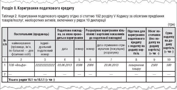 — додаток Д1, у розділі II якого була заповнена таблиця 2, коригування (зменшення) ПК, рядок 16.1 колонки Б декларації містив суму ПДВ (-500 грн).