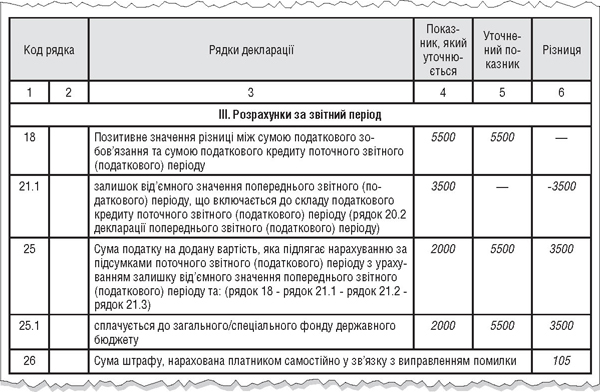 Виправлення записів у додатку 5 слід здійснити в розділі II «Податковий кредит» на суму уточнення з відповідним знаком (+ чи -) (у ситуації, що розглядається, — зі знаком «-», у колонці 4 на суму 17500, а в колонці 5 — 3500). При цьому в додатку зазначають не всі операції, а лише ту, яку потрібно відкоригувати (зняти).