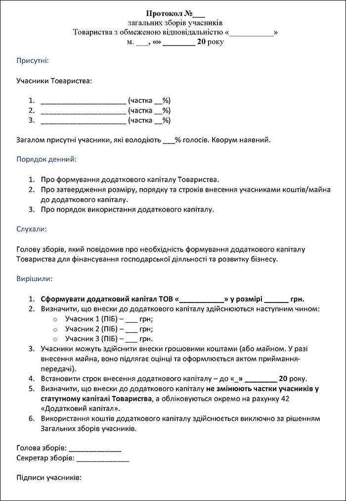 3.2. Розмір, форма та строки внесення додаткового капіталу визначаються протоколом Загальних зборів.