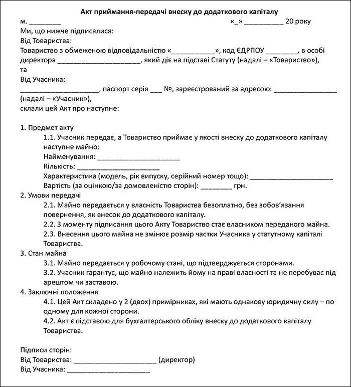 Зразок 2. Акт приймання внесків до додаткового капіталу (Завантажити)