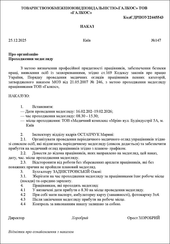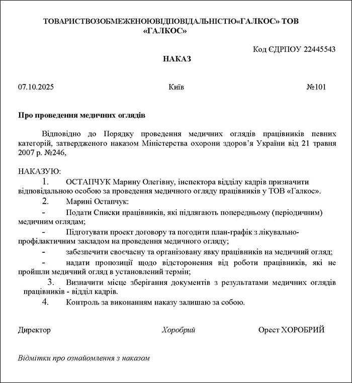 Крок 6. Видання наказу про організацію проходження медогляду працівниками.