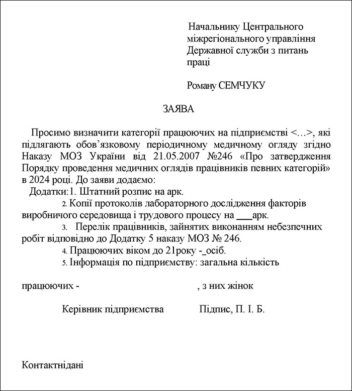 Роботодавці щороку до 1 грудня поточного року зобов’язані подати до органу Держпраці за своєю адресою заяву щодо визначення категорій працівників, які підлягають медичному огляду наступного року. Це потрібно, щоб фахівці Держпраці встигли своєчасно скласти і затвердити акт визначення категорій працівників, які підлягають обов’язковим медичним оглядам. Відповідно до п. 2.2 Порядку №246, саме на підставі поданої до 1 грудня заявки складається такий акт.