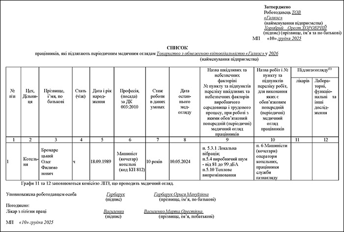 На основі отриманого акта роботодавець протягом одного місяця формує чотири примірники поіменних списків працівників, які підлягають періодичним медичним оглядам поточного року (див. зразок 3) (п. 2.3 Порядку №246).