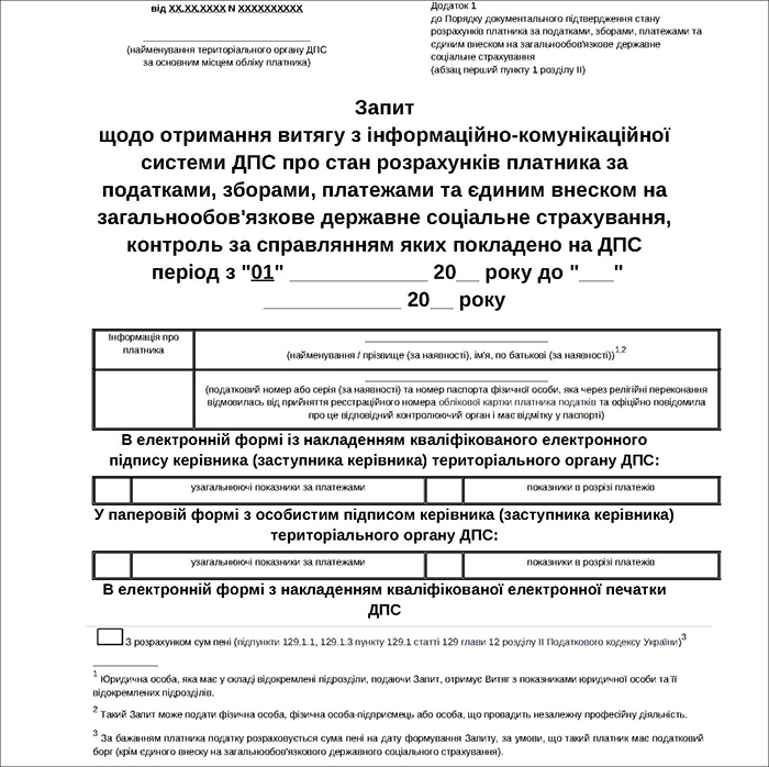 1. Запит подається платником до територіального органу ДПС за основним місцем обліку у паперовій формі або засобами електронного зв’язку в електронній формі згідно з додатком 1 до цього Порядку з дотриманням вимог Податкового кодексу України, Закону України «Про електронні документи та електронний документообіг», Закону України «Про електронну ідентифікацію та електронні довірчі послуги».
