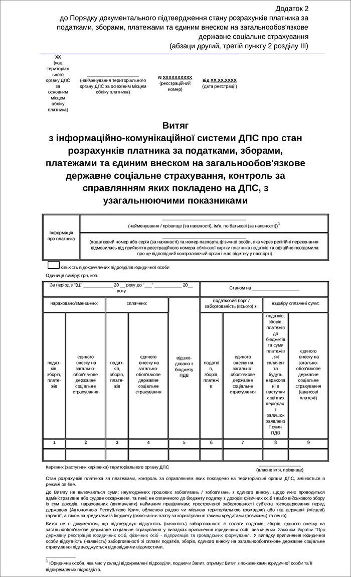 в електронній формі з узагальнюючими показниками за платежами за формою згідно з додатком 2 до цього Порядку або з показниками в розрізі платежів за формою згідно з додатком 3 до цього Порядку, які обліковуються в ІКС ДПС за основним / неосновним місцем обліку такого платника в територіальних органах ДПС, з накладанням КЕП керівника (заступника керівника) територіального органу ДПС — у разі якщо платником у Запиті обрано додатковий реквізит «в електронній формі з КЕП»;