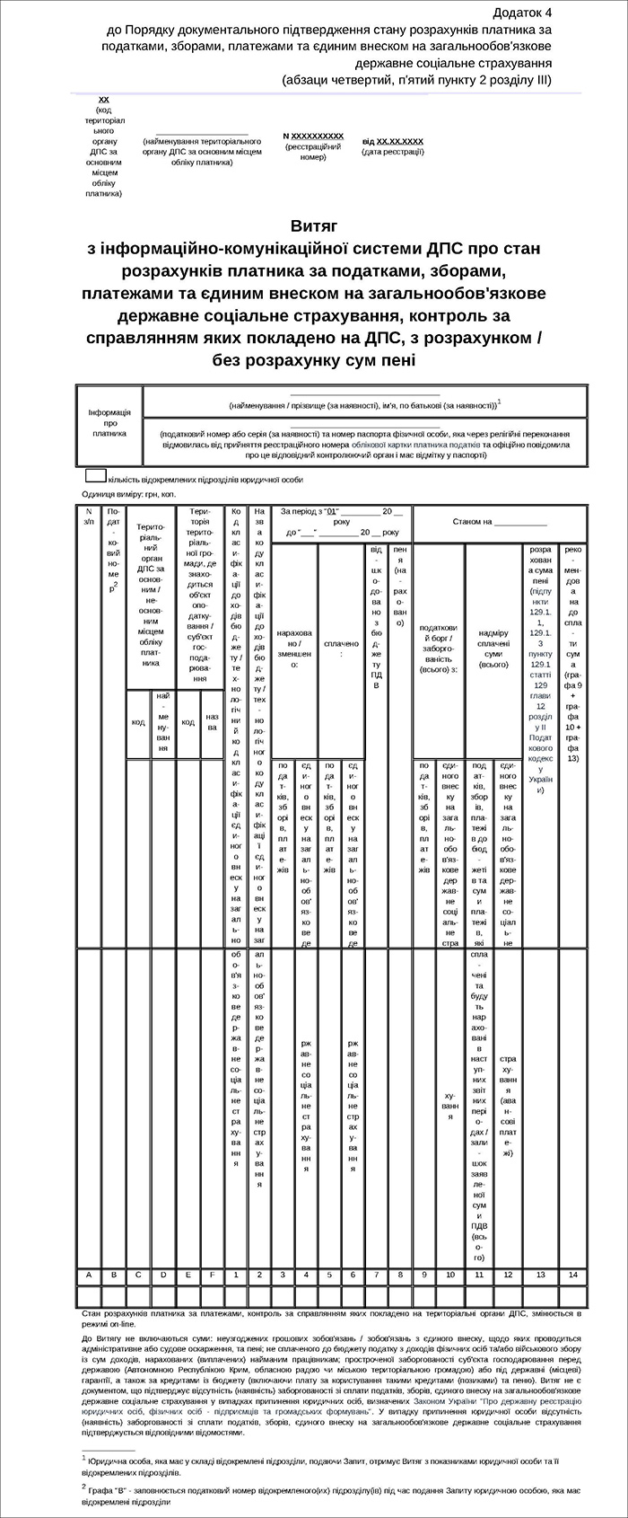 Якщо платником у Запиті не обрано додаткові реквізити, то платник отримає Витяг в електронній формі з показниками в розрізі платежів, які обліковуються в ІКС ДПС за основним / неосновним місцем обліку такого платника в територіальних органах ДПС, з накладенням кваліфікованої електронної печатки ДПС та без розрахунку сум пені за формою згідно з додатком 4 до цього Порядку.