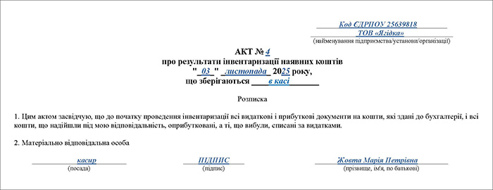 Зразок. Акт інвентаризації каси (Завантажити)