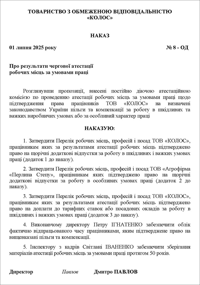 Зразок 1. Наказ про результати чергової атестації робочих місць за умовами праці (Завантажити)