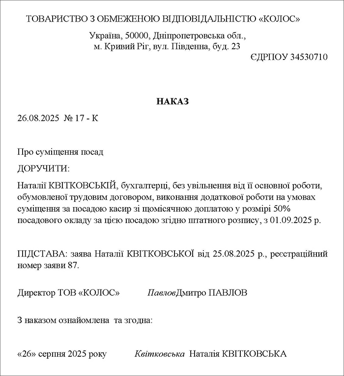 Зразок 3. Наказ на встановлення суміщення посад (Завантажити)