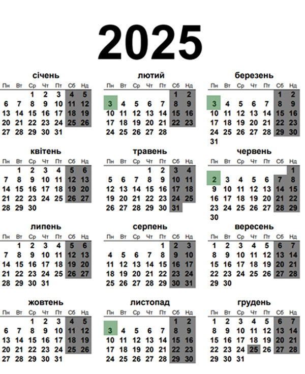 Для зручності пояснень див. календар на 2025 рік. Зверніть увагу на дати, виділені кольором: 3 лютого, 3 березня, 2 червня, 3 листопада.