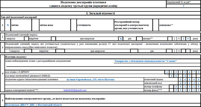 У верхній частині декларації заповнюють порядковий номер, тип, звітний період, назву податкової служби, куди подають декларацію, і дані платника податку (див. зразок 1).