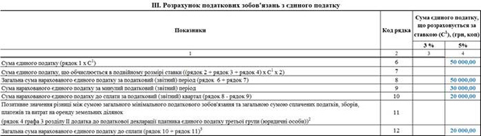 Розділ ІІІ. Розрахунок податкових зобов’язань з єдиного податку (див. зразок 3)