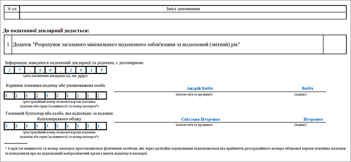 Наостанок зазначають дату подання декларації, РНОКПП, підпис, власне ім’я та прізвище керівника й особи, яка відповідає за ведення бухобліку.