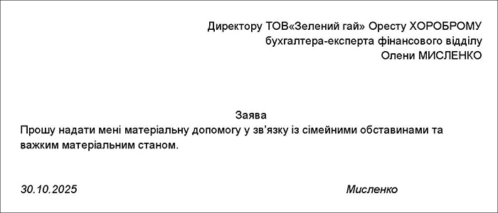 Зразок заяви на надання матеріальної допомоги (Завантажити)