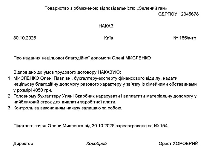 — складений наказ керівника підприємства на підставі даних щодо таких заяв про надання благодійної допомоги;