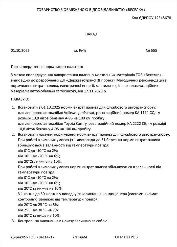 2. Нормування витрат палива на роботу автомобілів. Юрособи і ФОПи повинні мати норми витрат палива для всіх своїх автомобілів. Для одного автомобіля можна застосовувати декілька норм залежно від умов його роботи. Юрособи затверджують норми наказом керівника, а ФОП може видати розпорядження за формою, аналогічною до форми наказу.