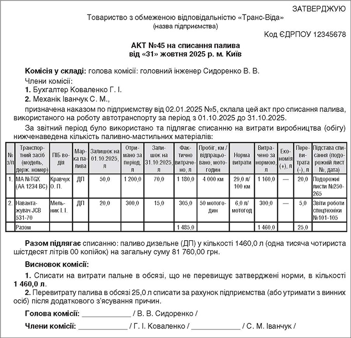 Приклад. У жовтні 2025 року автомобіль (авто 1) використовувався для поїздок менеджера з метою надання послуг клієнтам. Згідно з подорожніми листами авто 1 проїхало 1 030 км, норма витрат бензину — 6 л на 100 км. Авто 1 витратило: 1 030 км / 100 км х 6 л = 61,8 л. Автомобіль директора проїхав за місяць 1 575 км, норма витрат бензину — 11 л на 100 км. Авто 2 витратило :1 575 км / 100 км х 11 л = 173,25 л. Для списання цього бензину складено два окремі акти. Після списання палива в баку авто 1 обліковується залишок 8,2 л бензину на суму 492,00 грн, а в баку авто 2 — 9,3 л на суму 558,00 грн.