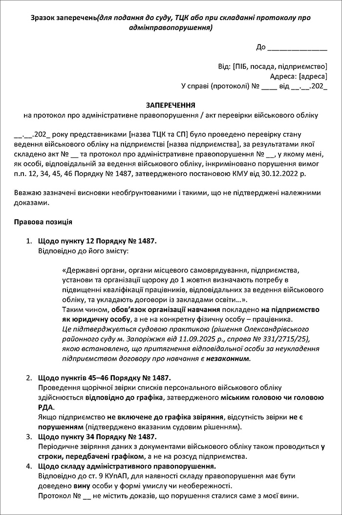 Для найуспішнішого захисту посадової особи будь-якого підприємства надаємо зразок заперечень (можна використати як орієнтовну форму або для суду, або для відповіді на акт/протокол ТЦК) і алгоритм захисту відповідальної особи за ведення військового обліку на підприємстві.