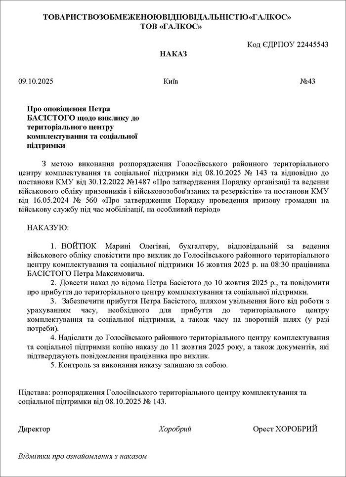 Керівник підприємства видає наказ про оповіщення зазначених у розпорядженні ТЦК осіб.
