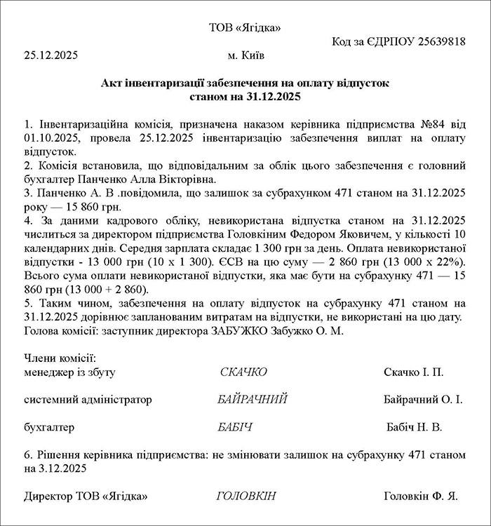 Зразок. Акт інвентаризації забезпечення на оплату відпусток (Завантажити)
