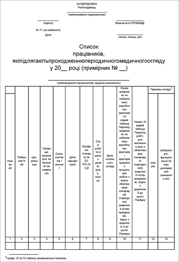 Роботодавець протягом місяця з дати складення Переліку на його підставі складатиме та в місячний строк погоджуватиме з первинною профспілковою організацією підприємства або представником трудового колективу, з лікарем з гігієни праці Держпраці поіменний список працівників, які підлягають проходженню періодичного медичного огляду (далі — Список працівників). Форма Списку працівників затверджена додатком 2 до Порядку №1393.