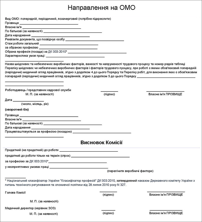Під час прийняття на роботу осіб, які належать до категорій, які повинні проходити ОМО (ми їх зазначили вище), роботодавець надає особі Направлення на ОМО (далі — Направлення) за формою, наведеною у додатку 3 до Порядку №1393.