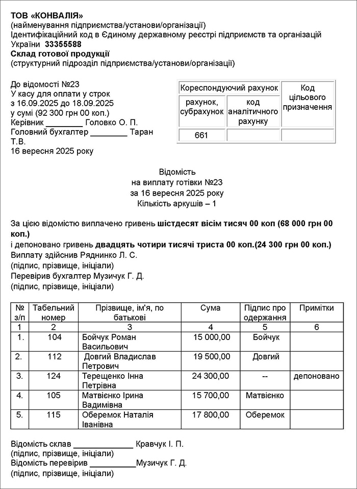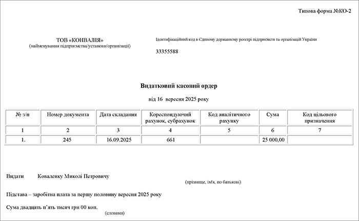 Приклад. У касі є залишок готівки в сумі 10 500 грн. Ліміт каси — 15 000 грн. 1 вересня 2025 р. отримано з банку 145 000 грн на виплату зарплати за серпень 2025 р. і того самого дня передано до каси відомість на цю суму. Строк виплати зарплати — з 01.09.2025 до 05.09.2025.