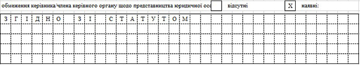 Увага! У разі відсутності обмежень щодо представництва керівника (у нашому випадку — голови правління) або члена керівного органу слід поставити позначку «Відсутні». Якщо ж обмеження є, їх зазначаємо на аркуші 3 — в такому разі всі обмеження можна буде побачити у відкритому доступ до ЄДР та у Витягу (як на зразках 7 або 8).