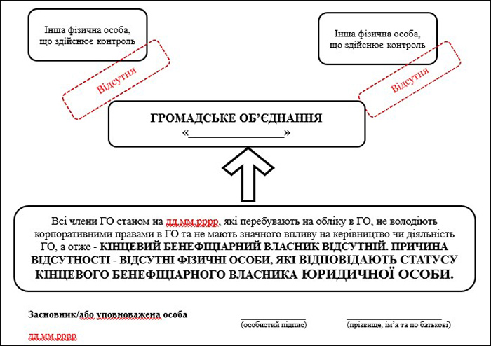 При цьому обґрунтовану причину відсутності зазначити у структурі власності, зокрема: «відсутні особи, що відповідають терміну «Кінцевий бенефіціарний власник» згідно з чинним законодавством», як у зразку 10 (ознайомитися зі зразком від Мін’юсту можна за посиланням, наведеним на початку).