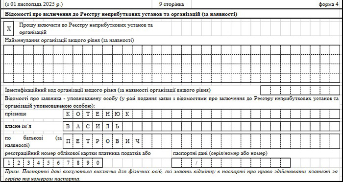 На ній ставлять позначку в полі «Прошу включити до Реєстру неприбуткових установ та організацій».