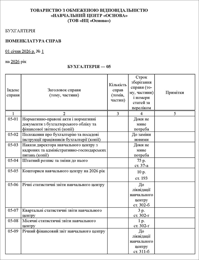 Зразок заповненої номенклатури справ бухгалтерії на 2026 рік (Завантажити)