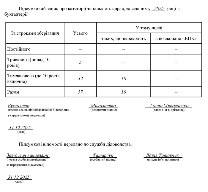 Керівник служби діловодства (або особа, відповідальна за діловодство в юрособі), своєю чергою, зводить усі відомості разом, підписує підсумковий запис зведеної номенклатури справ й повідомляє керівника архівного підрозділу (або особу, відповідальну за архів юрособи) про фактичну наявність справ, заведених в юрособі у 2025 році.