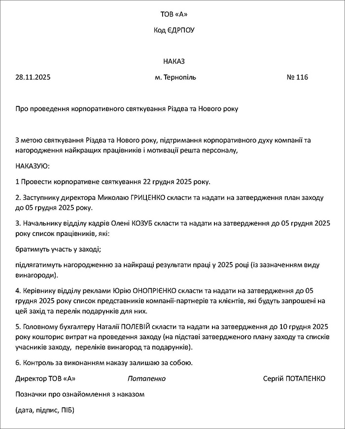 Звісно, що це, по суті, лише підготовча стадія і знайомити з цим наказом решту працівників (які в ньому не зазначені) ще зарано. Але, після того як усі підготовчі дії буде завершено і все буде готово: списки підготовлено, подарунки придбано, приміщення, де святкуватимуть, визначено, працівників треба буде повідомити про свято.