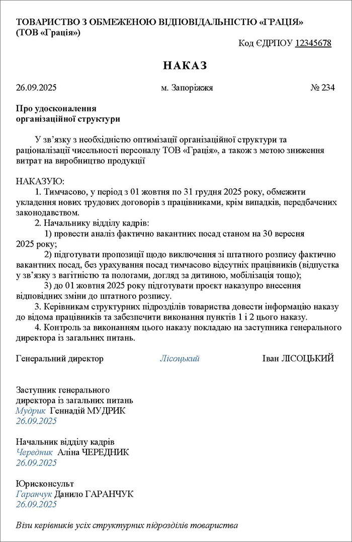 Зразок 1. Наказ про удосконалення організаційної структури підприємства (Завантажити)