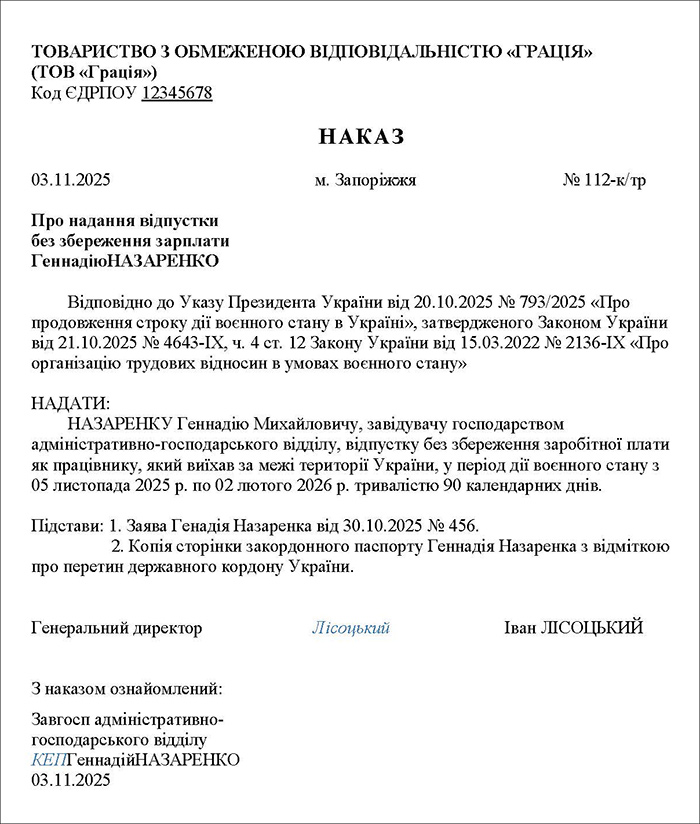 Зразок 3. Наказ про надання відпустки без збереження зарплати (Завантажити)