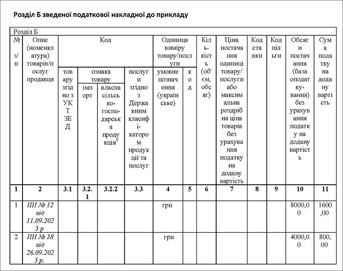 — відповідно до ПН №58 від 26.09.2025 на суму 12 000 грн (в т. ч. ПДВ — 2 000 грн). База оподаткування — 10 000 грн.