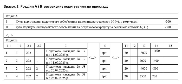 — за ПН №12 від 11.09.2025 — 7 000 грн (20 000 х 0,35), а сума нарахованого ПДВ має бути 1 400 грн (7 000 грн х 20%). Розбіжність між «старою» і «новою» базою становитиме «мінус» 1 000 грн (7 000 грн - 8 000 грн). Отже, суму ПДВ слід зменшити на 200 грн (1 400 грн - 1 600 грн);