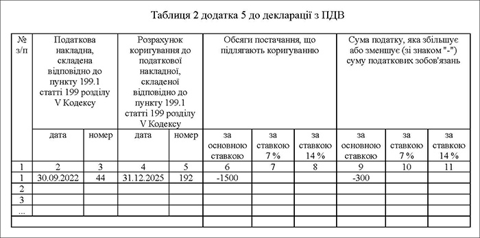 Зразок 3. Таблиця 2 до додатка 5 декларації з ПДВ за грудень 2025 року (Завантажити)