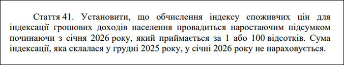 «Установити, що обчислення індексу споживчих цін для індексації грошових доходів населення провадиться наростаючим підсумком починаючи з 1 січня 2026 року, який приймається за 1 або 100 відсотків. Сума індексації, яка склалася у грудні 2025 року, у січні 2026 року не нараховується».