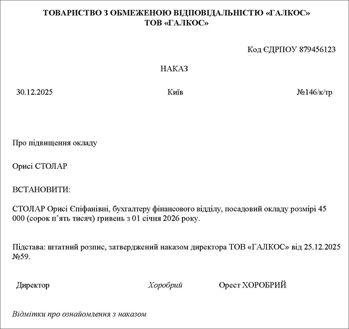 Зразок 2. Наказ про підвищення окладу працівнику (Завантажити)