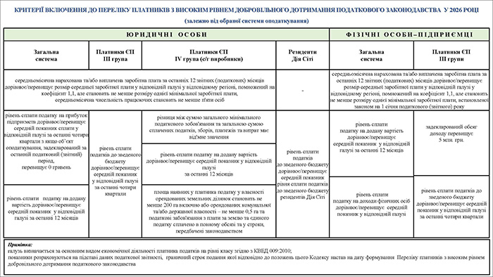 Критерії включення до Переліку платників з високим рівнем добровільного дотримання податкового законодавства у 2026 році (Завантажити)