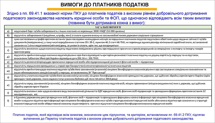 Так, Законом №3813 визначено вимоги (однакові для всіх платників) та критерії (залежно від обраної платником податків системи оподаткування) для включення платника податків до Переліку платників податків з високим рівнем добровільного дотримання податкового законодавства (далі — Перелік).