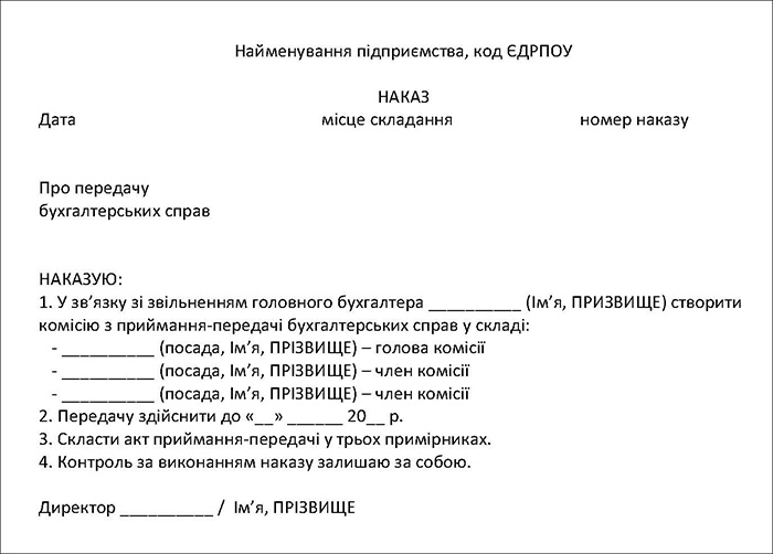 | Наказ керівника про звільнення головного бухгалтера та (по змозі) про прийняття на роботу нового головного бухгалтера | Насамперед керівник видає наказ про звільнення головного бухгалтера. Якщо на цей момент уже знайдено іншу особу, яка буде працювати на посаді головного бухгалтера, то керівник видає наказ про прийняття на роботу цієї іншої особи. Можливий варіант, коли на посаду головного бухгалтера переводиться інший працівник — тоді керівник видає наказ про призначення на посаду головного бухгалтера такого іншого працівника. Якщо ж остаточної кандидатури немає, то в наказі про звільнення головного бухгалтера обов’язково зазначають, хто тимчасово виконуватиме обов’язки головного бухгалтера: наприклад, заступник головного бухгалтера або, можливо, і сам керівник підприємства. Також керівник видає наказ, у якому зазначає: дату передачі справ, склад комісії, яка контролюватиме передачу справ, строк передачі, перелік документів, які мають бути складені. |