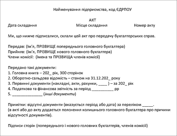 | Акт приймання-передачі справ | Складають акт, у якому зазначають перелік документів з описом (рік складання, кількість сторінок тощо), фіксують зауваження, що є не передані документи й пояснення. Акт підписують звільнений бухгалтер, члени комісії, погоджує керівник. | Три примірники: для кожної сторони з обов’язковим зберіганням в архіві. Якщо виявлено відсутні документи, — обов’язково уточнити причини. |