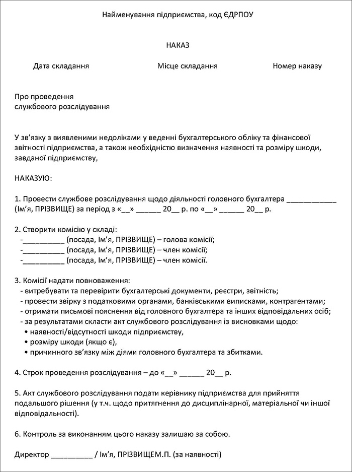 Цей акт зазвичай є додатком до наказу про проведення службового розслідування. Його структура універсальна: передбачена для випадків із головним бухгалтером та іншими відповідальними особами.