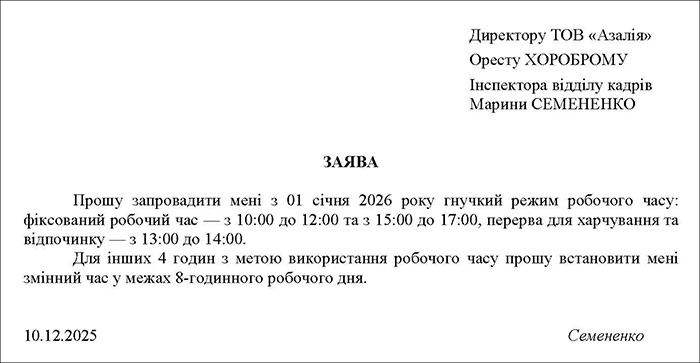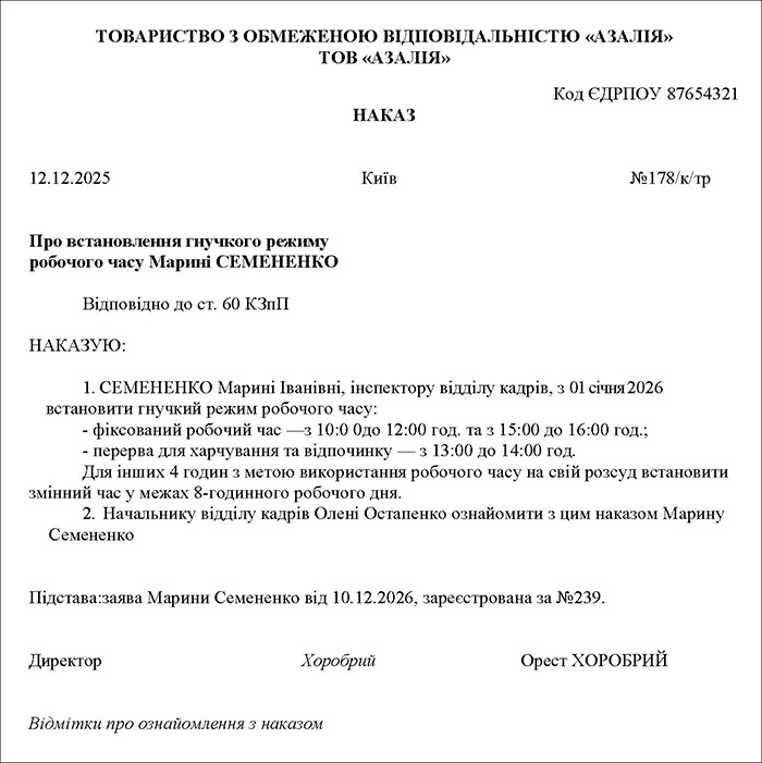| Закріплення умов | У наказі чи договорі визначають: фіксований час, змінний час та час перерви |